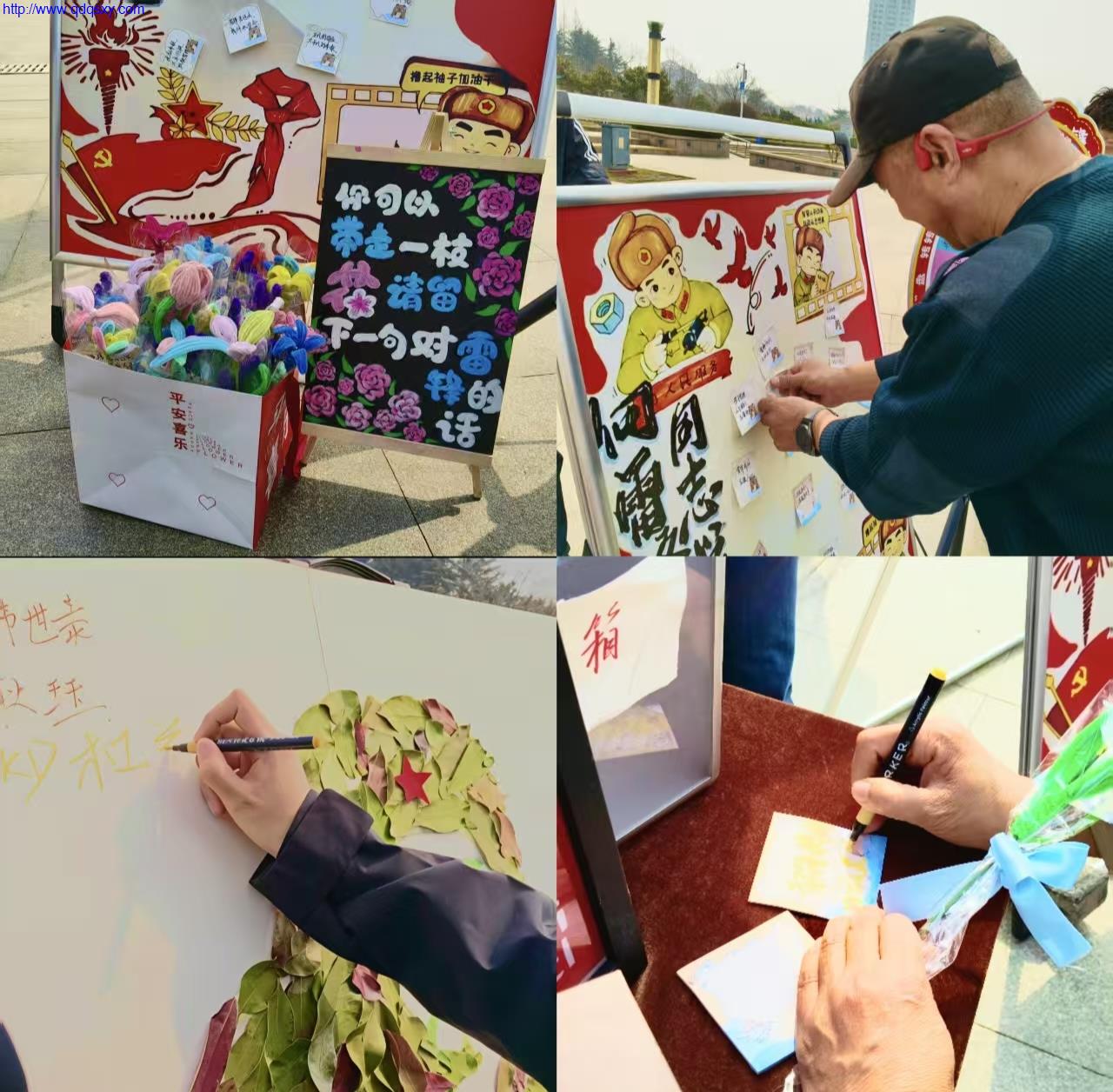 活动现场,“你可以带走一枝花,请留下一句对雷锋的话”的温馨提示,吸引了无数路人驻足参与。在同学们的热情引导下,大家纷纷拿起便利贴,写下对雷锋的缅怀、敬意与感悟,将一句句滚烫的话语贴满主题KT板;随后,大家在精心制作的雷锋树叶拼贴画上郑重签下自己的名字,用一笔一画共同完成这份承载着爱与传承的集体作品,让每一份心意都成为雷锋精神的生动注脚。