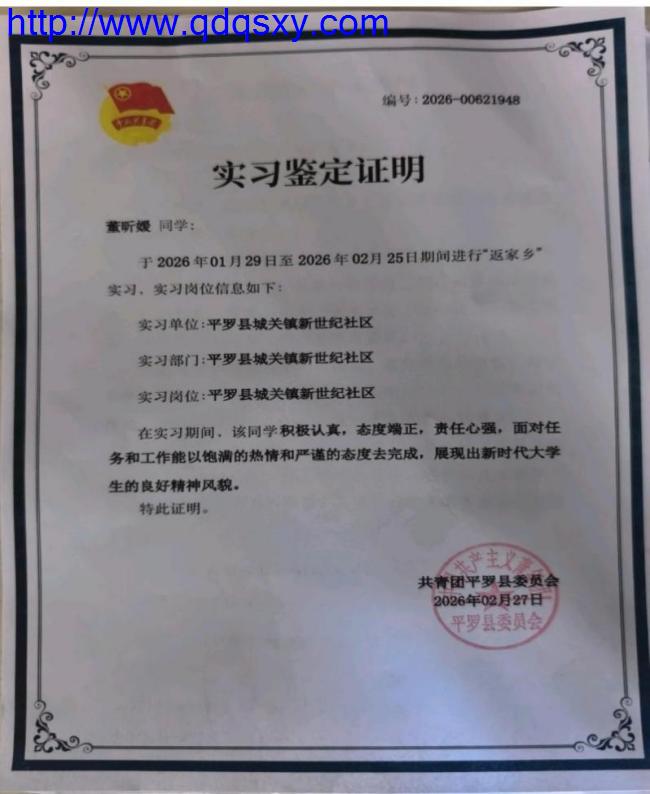 宁夏回族自治区平罗县团委在给评价董昕媛同学实践评价中说,面对任务和工作能以饱满的热情和严谨的态度去完成,展现出新时代大学生的良好精神风貌。