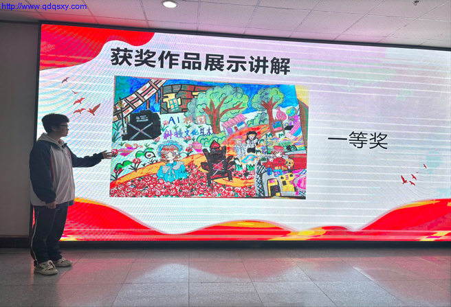 想象一下,未来的校园会是什么模样?同学们用手中的画笔,给出了他们的答案。其中《智慧树下的课堂》这幅作品的让人印象深刻,画面整幅是将课堂置于一棵巨大的“智慧树”之下。“树”象征着生命、成长与互联。它寓意在AI的赋能下,知识将如阳光雨露般自然流淌,滋养每一个独特的个体,教育不再是单向灌输,而是在一种被支持和滋养的环境中,实现自主、自然的“生长”。