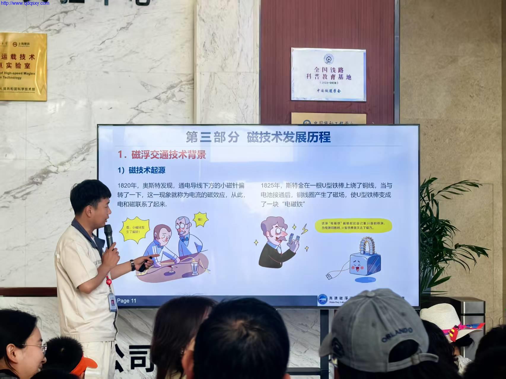 活动伊始,中车四方技术人员对高速磁浮列车是怎么“浮起来”的?高速磁浮是怎么实现时速600公里“贴地飞行”的等诸多问题进行讲解,同学们学习了高速磁浮的科学原理,了解了高速磁浮尖端技术背后的“科学奥妙”。