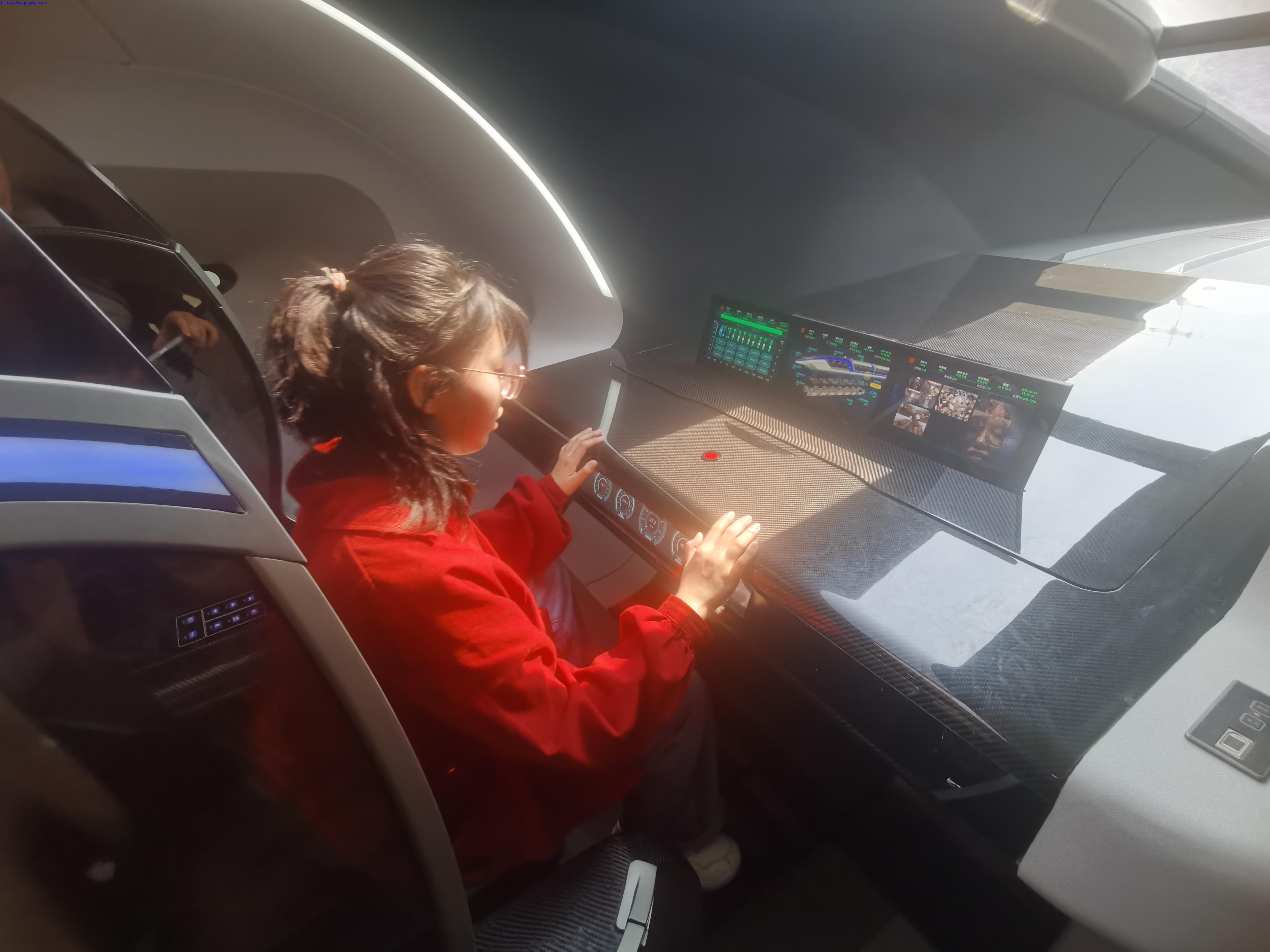 活动高潮环节,师生团队试乘了实验室研发的时速600公里高速磁浮列车。在青岛高速试验线示范段上,列车以平稳姿态完成加速、巡航、制动全流程演示。启动过程中,列车平稳加速,窗外景物如流光般掠过,车厢内却几乎感受不到颠簸与噪音。为了更深入体验“贴地飞行“的科技感,同学们轮流到列车驾驶室体验加速过程。“加速过程像被一只无形的手稳稳托住,这种科技感太酷了!”高速铁路客运服务专业的孙梦珍难掩兴奋。