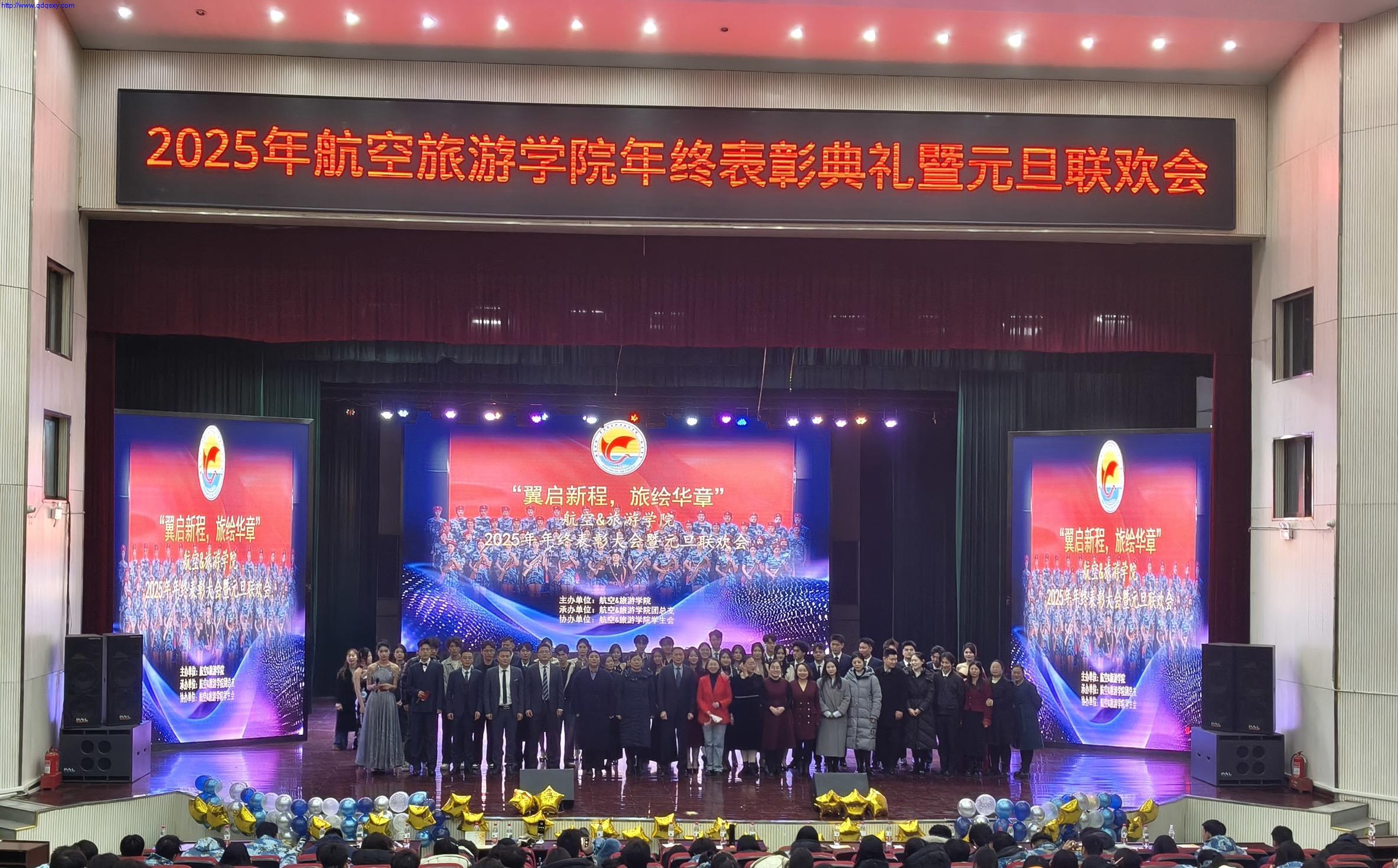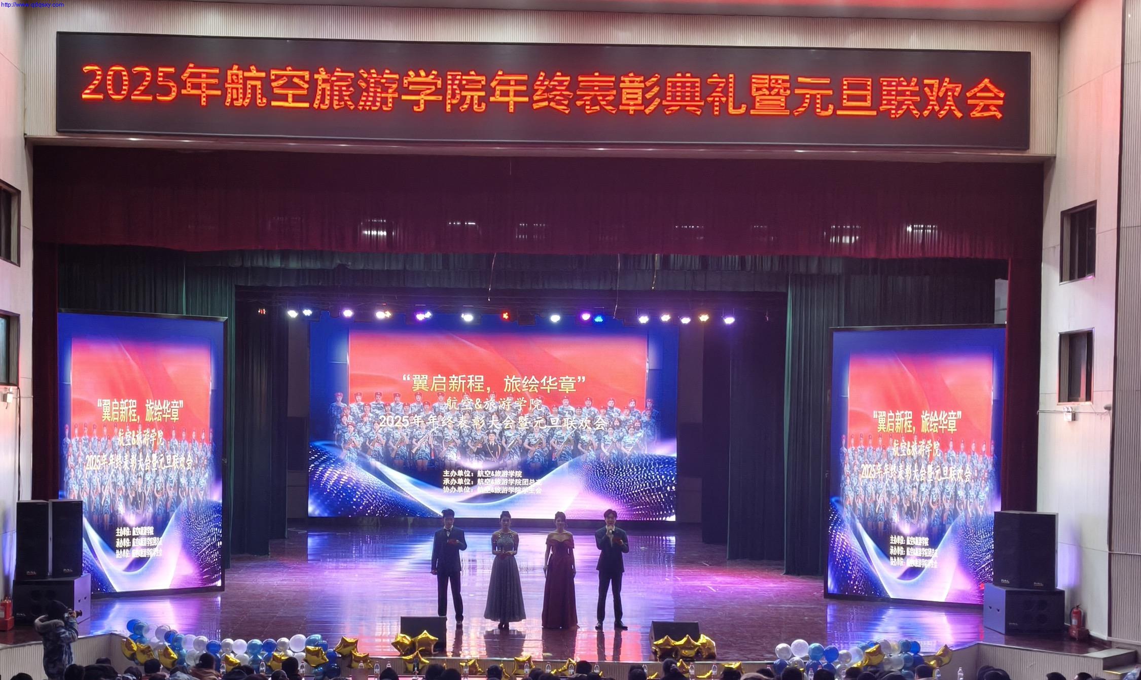 2025年12月24日,航空服务学院、旅游酒店管理学院联合举办的“翼启新程,旅绘华章”年终表彰大会暨元旦联欢晚会在学院求实会堂隆重举行。航空服务学院、旅游酒店管理学院领导、全体教职工与全体同学欢聚一堂,共同回顾奋斗足迹,喜迎新年到来。