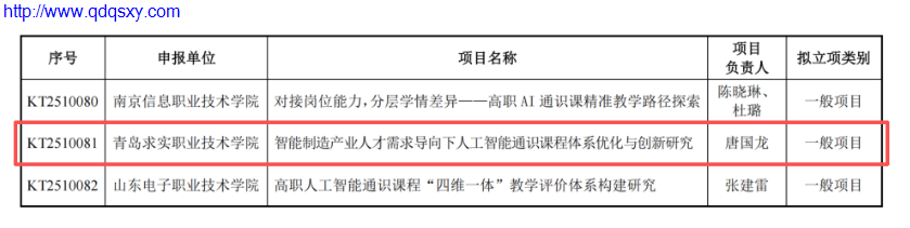 近日,教育部职业院校信息化教学指导委员会正式公示2026年度全国高等职业院校人工智能通识课程应用与创新研究项目评选结果,青岛求实职业技术学院机电工程学院申报的《智能制造产业人才需求导向下人工智能通识课程体系优化与创新研究》(项目编号:KT2510081)成功立项,彰显了学院在人工智能教育与专业建设融合领域的扎实研究基础和创新实践能力。