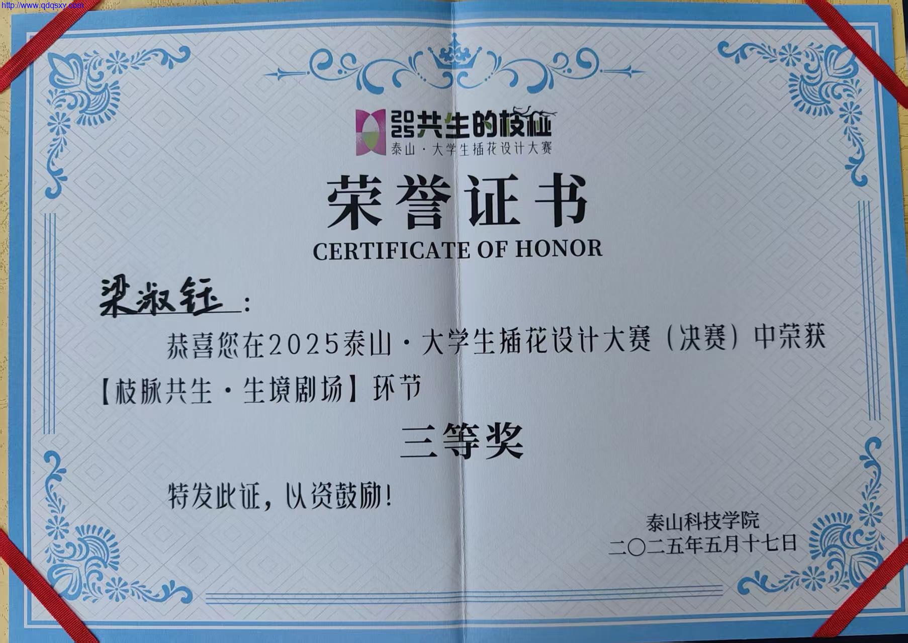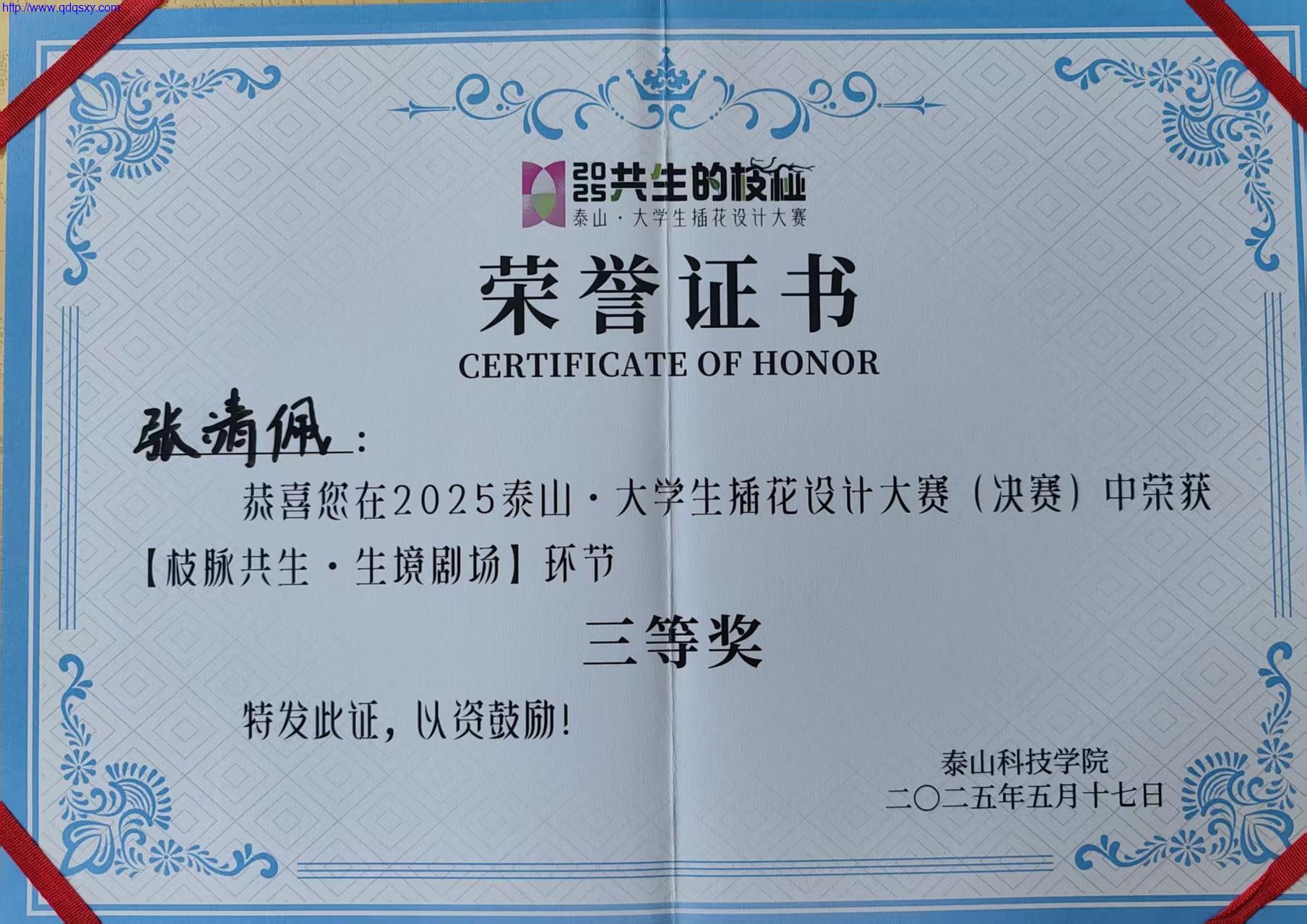 2025泰山·大学生插花设计大赛决赛5月17日在泰山科技学院举行。青岛求实职业技术学院建筑工程学院园林技术专业张靖佩、梁淑钰组成的春之晓队获得三等奖。建筑工程学院教师谢卓、赵深担任指导老师。