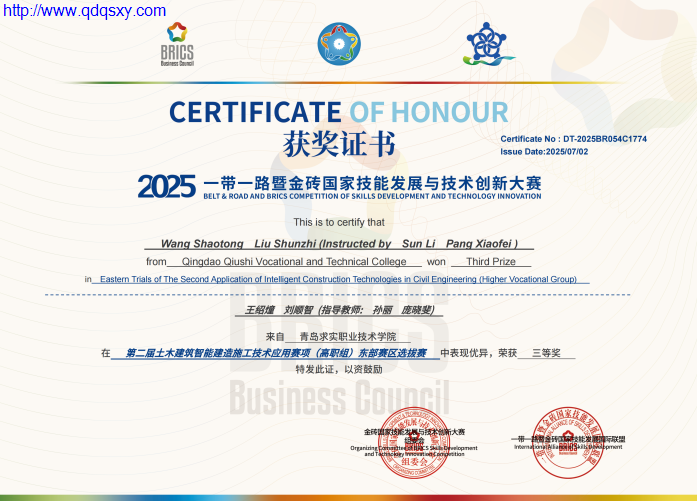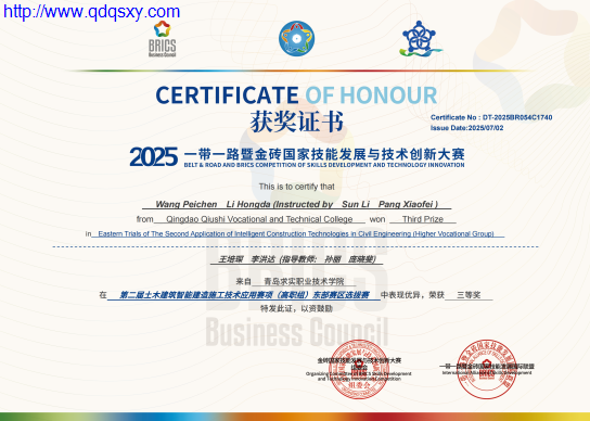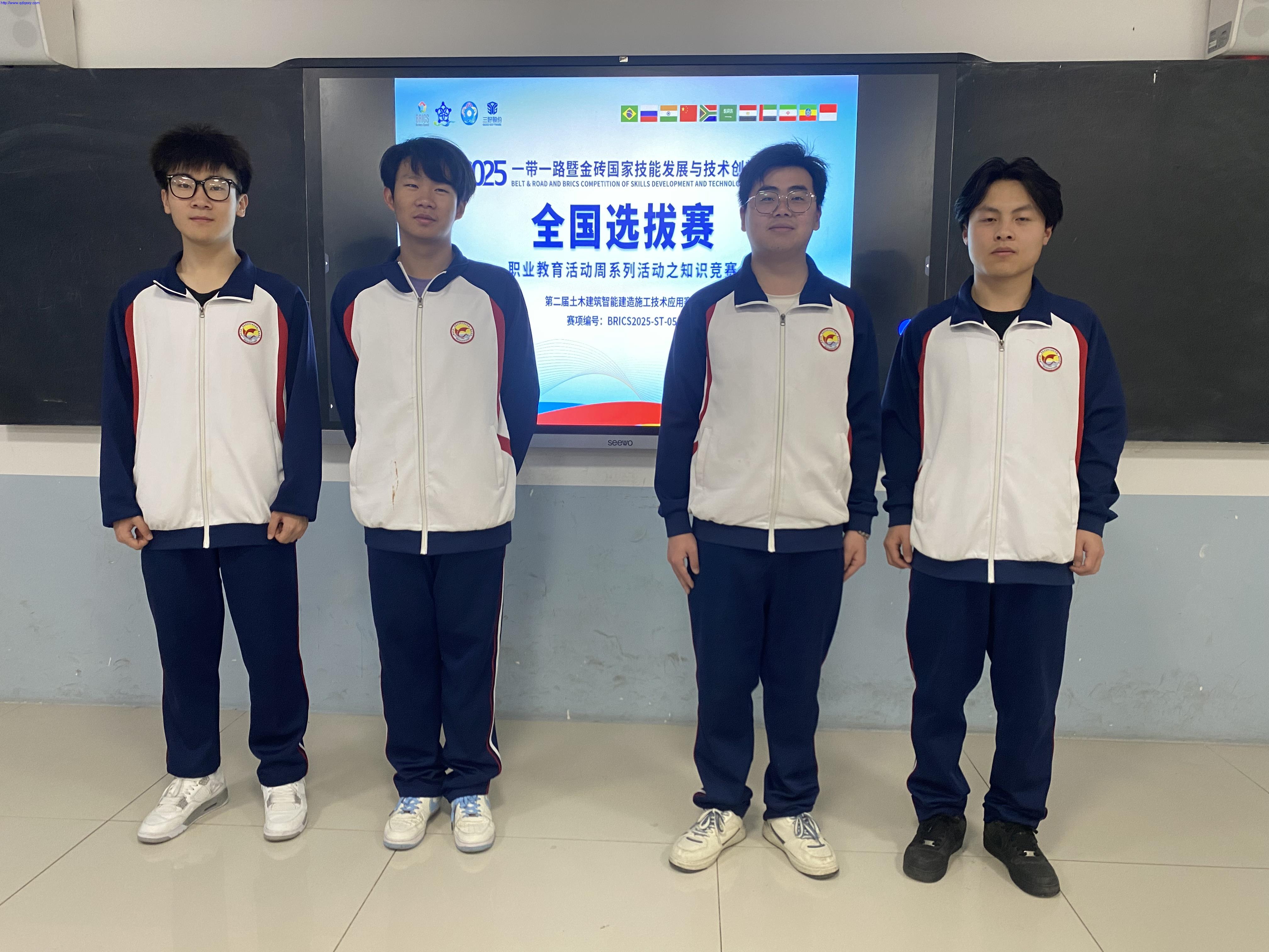 近日,建筑工程学院组织由2024级建筑工程技术专业4名学生组成的2支代表队,参加2025年一带一路暨金砖国家技能发展与创新大赛-建筑工程智能建造施工技术应用竞赛,经过激烈比赛荣获区域赛三等奖。