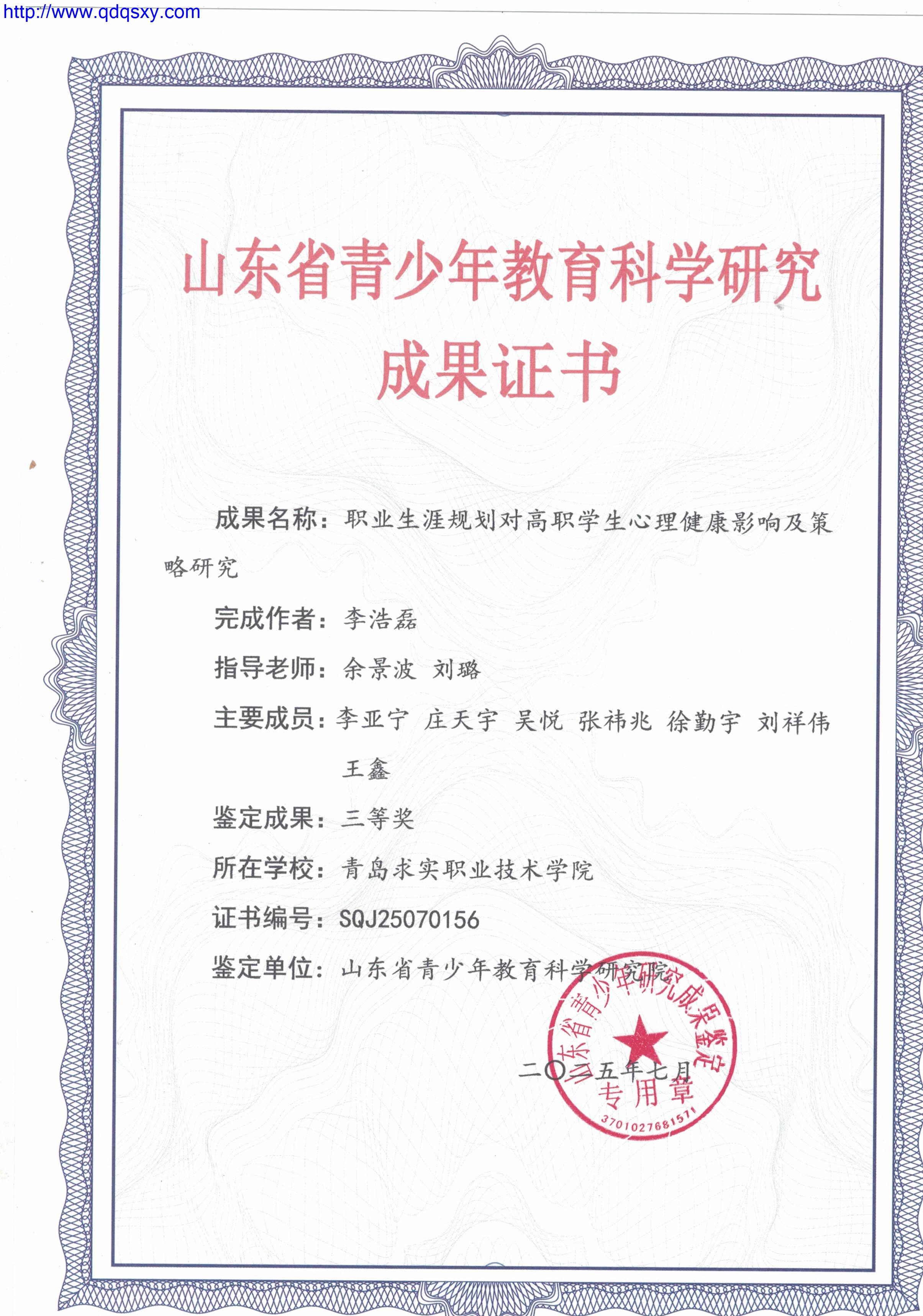 近日,山东省青少年教育科学研究成果评审结果发布,建筑工程学院学生李浩磊申报的成果《职业生涯对高职学生心理健康影响及策略研究》获三等奖。