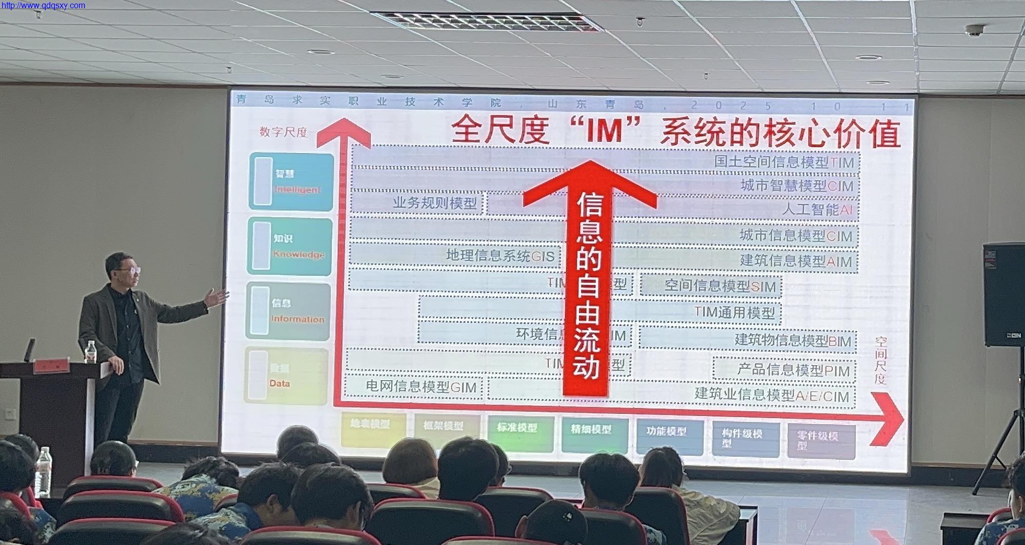 讲座由建筑工程学院副院长高娜娜主持,讲座中,张教授详细阐述了系统阐述了一个整合了建筑信息模型(BIM)、城市信息模型(CIM)、地理信息系统(GIS)等多种技术的宏大框架。张教授进一步强调,推动信息的自由流动与智能应用是未来发展的关键。通过将人工智能(AI)与物联网(IoT)技术深度融入此信息模型框架,可以构建起支撑规划、建设、管理和服务的统一数字底座,彻底打破“信息孤岛”,为智慧城市的建设、数字孪生的实现以及行业的可持续发展提供坚实的技术支撑,并结合实际案例,生动展示了信息模型技术框架在实际项目中的应用与成效。