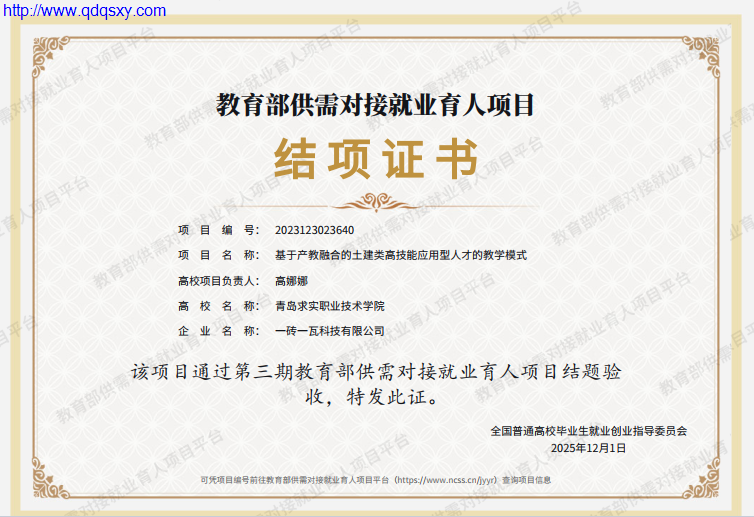 近日,建筑工程学院承担第三期教育部供需对接就业育人项目-定向人才培养培训项目“基于产教融合的土建类高技能应用型人才的教学模式”顺利结项。