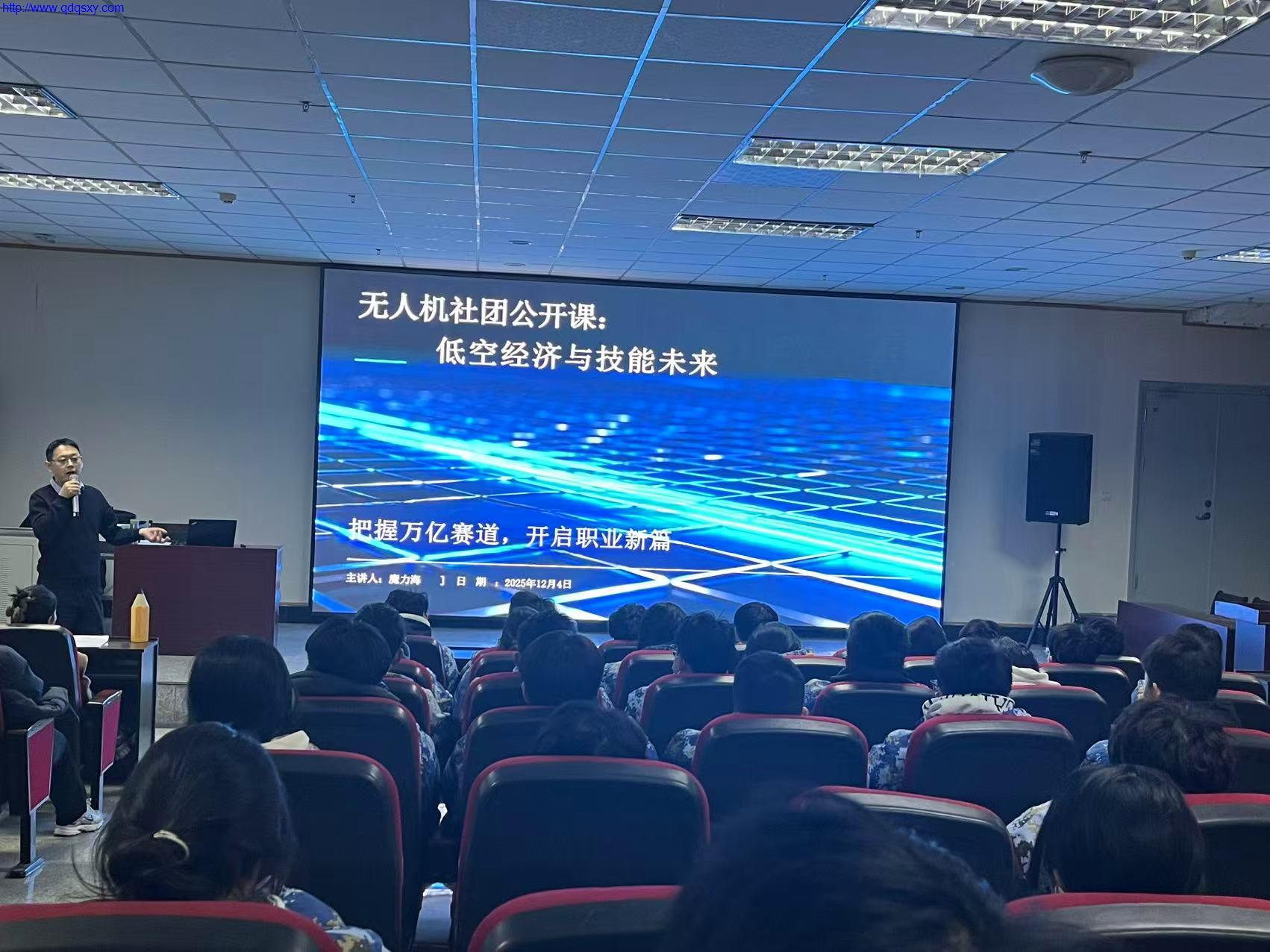 为深入贯彻落实国家“大众创业、万众创新”决策部署,推动职业教育与新兴产业深度融合。12月4日,青岛求实职业技术学院建筑工程学院联合无人机社团,在图书馆报告厅成功举办“把握万亿赛道,开启职业新篇”主题讲座。本次活动特邀国家体育总局国防体育运动高级教练员、山东航空产业协会理事李承才老师,围绕低空经济政策、无人机行业应用及未来趋势展开深度解析,为师生带来一场技术与职业发展的思想盛宴。