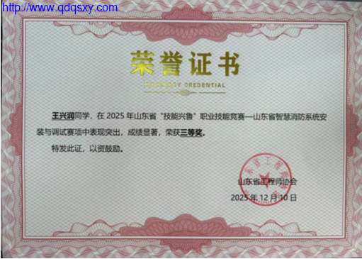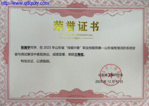 2025年山东省“技能兴鲁”职业技能大赛——山东省智慧消防系统安装与调试职业技能竞赛近日在烟台工程职业技术学院举行。本次比赛由山东省工程师协会主办,聚焦智慧消防领域前沿技术。赛事设置火灾自动报警、防火卷帘、应急照明与疏散指示系统等典型项目,全面检验参赛选手的设计、实操与研判综合能力。经过激烈角逐,青岛求实职业技术学院学生王兴润、张瀚宇在比赛中表现突出,荣获本次大赛三等奖。