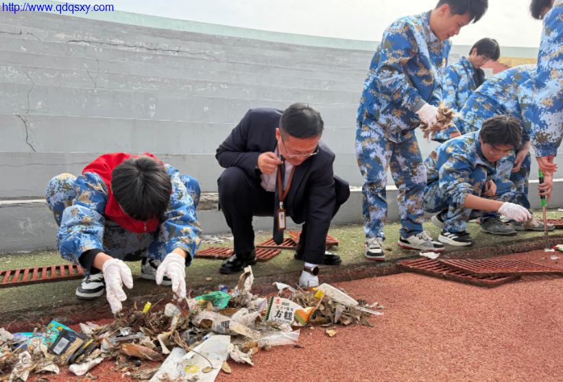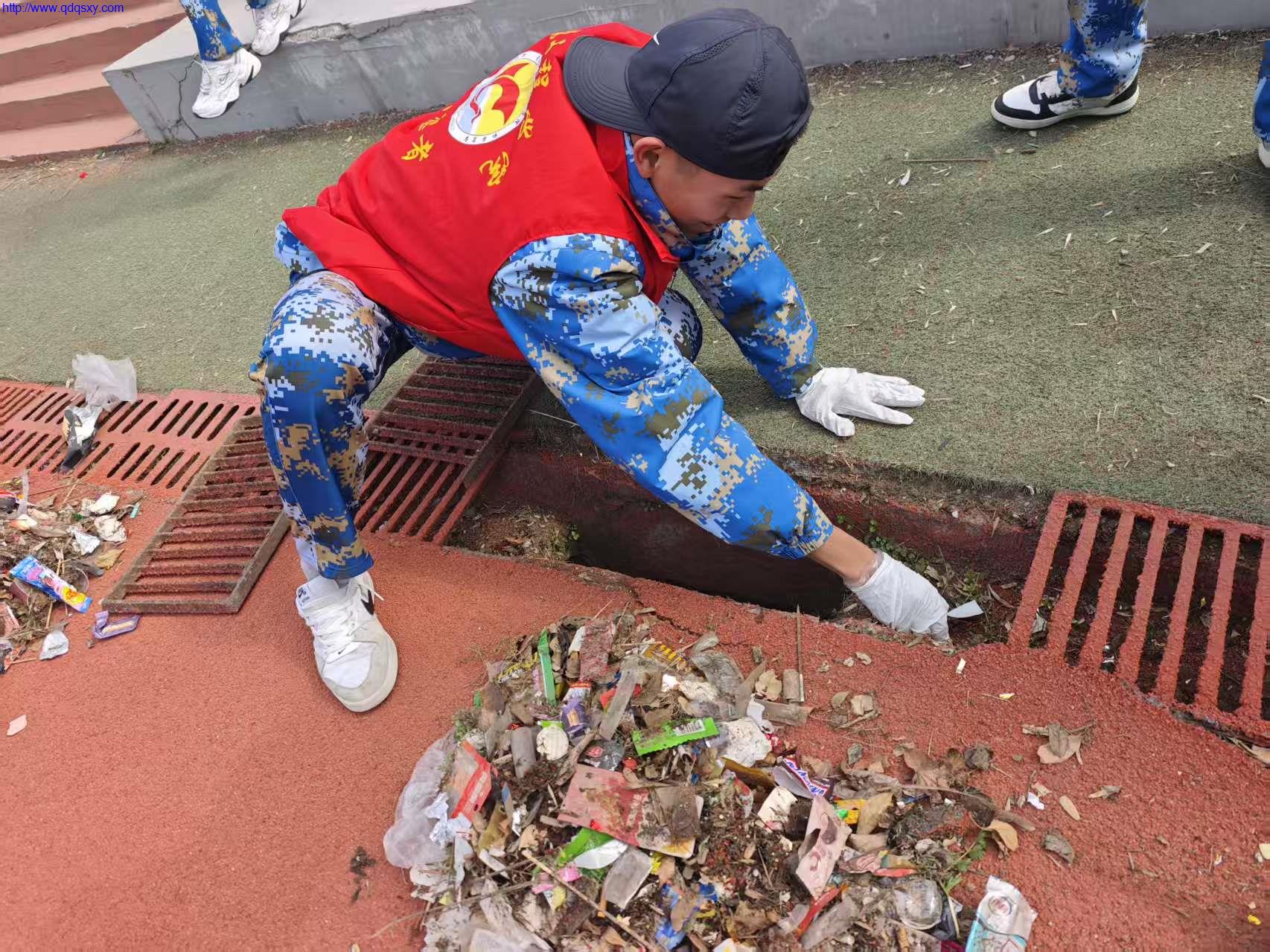 活动现场,师生志愿者们热情高涨、分工协作,化身校园“美容师”,手持清洁工具,认真清理体育场塑胶跑道周边下水道口的堆积垃圾、杂草杂物。