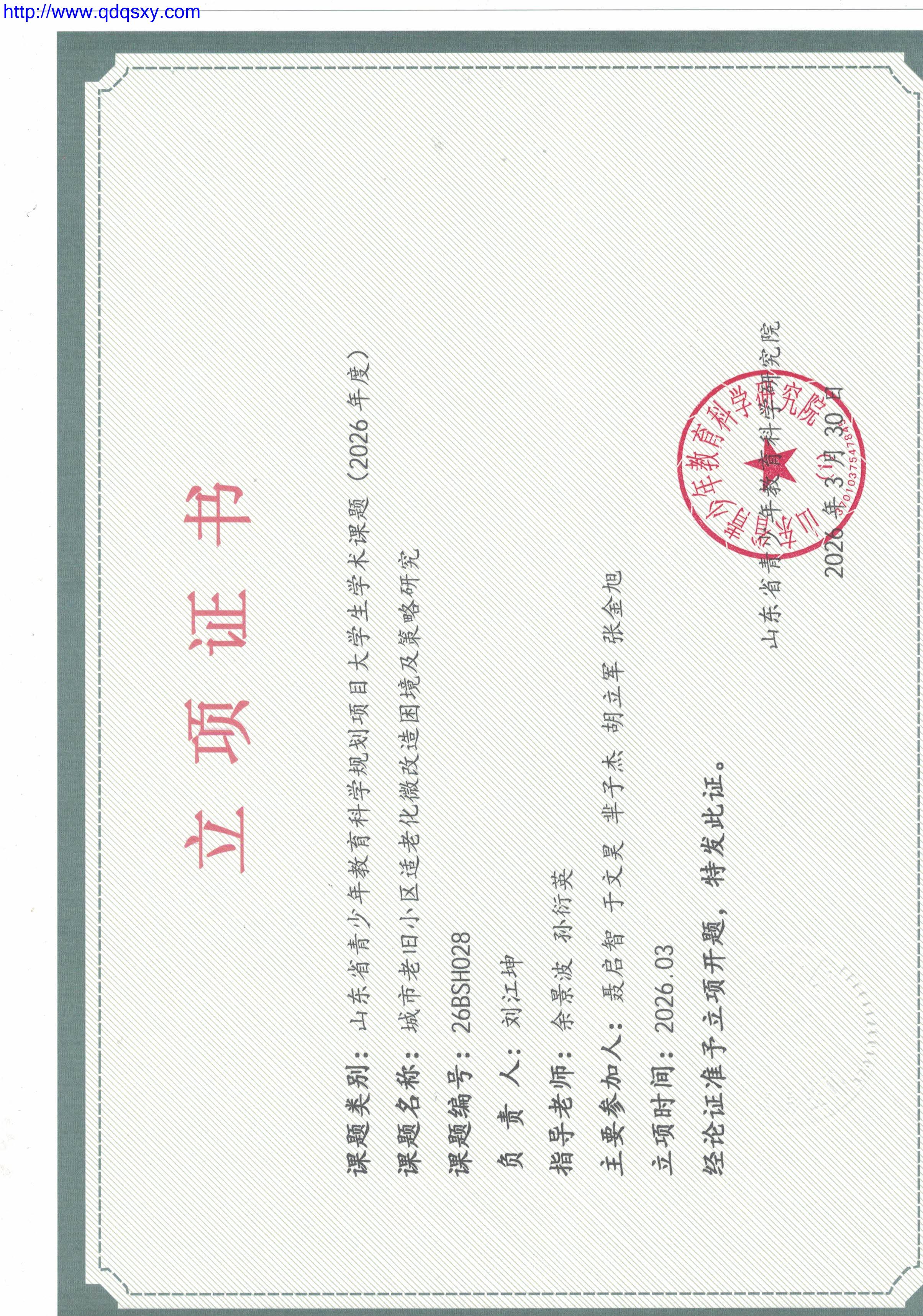 近日,山东省青少年教育科学规划项目大学生学术课题立项评审结果已顺利揭晓,建筑工程学院1项申报项目《城市老旧小区适老化微改造困境及策略研究》被获得立项。本研究项目以社会老龄化为背景,研究城市老旧小区适老化微改造存在的问题,从绿色低碳角度提出对策。