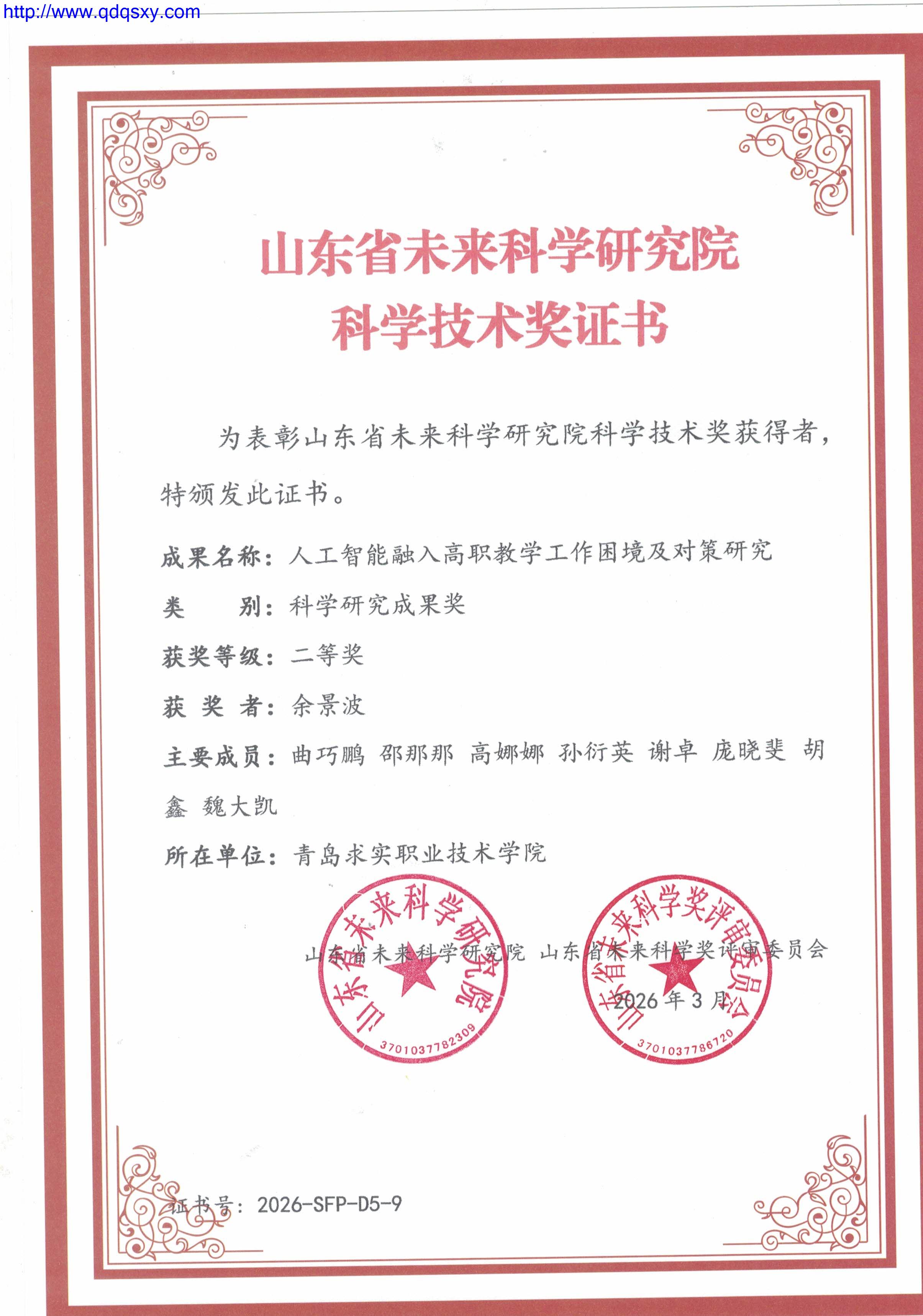 近日,山东省未来科学奖评审委员会公布山东省未来科学研究院科学技术奖评审结果,由建筑工程学院申报的《人工智能融入高职教学工作困境及对策研究》项目获得2026年山东省未来科学研究院科学技术二等奖。该成果成功基于人工智能对高职教学影响,提出人工智能赋能高职教学技术要领,对促进高职教学改革有一定的价值。 该项目获奖是建筑工程学院在数字化人才培养试点改革领域取得的重要理论和实践成果,为建筑工程学院智慧建造与城市安全专业群的建设和发展提供了。