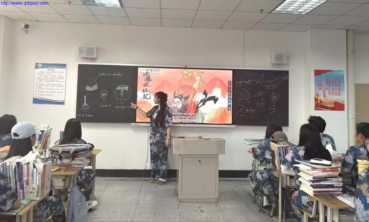 活动以一段反映端午节起源的英文视频缓缓拉开帷幕。视频中,屈原怀石投江的爱国抉择、百姓冒雨划船打捞并投粽入水的深情守护,勾勒出千年传承的家国情怀,让同学们深刻感受到,端午的民俗记忆里,沉淀着中华民族对爱国精神的永恒追思,这份跨越时空的精神共鸣,正是文化自豪感的根基。