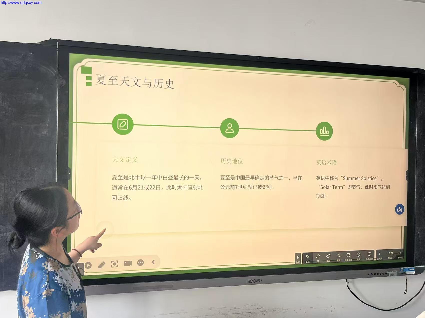 首先是“夏至习俗探索小队”,他们用精心制作的PPT和短视频,为大家介绍了中国不同地区丰富多彩的夏至习俗。在北方,尤其是北京地区,有着“冬至饺子夏至面”的说法。老北京人在夏至这天,会吃上一碗清爽可口的炸酱面,面条劲道爽滑,黄瓜丝、豆芽等配菜新鲜脆嫩,再加上浓郁醇厚的炸酱,不仅消暑开胃,更承载着对生活的美好期盼。而在陕西,人们喜欢吃夏至凉粽,糯米软糯,粽叶清香,蘸上白糖,一口下去,甜蜜在舌尖散开,让人回味无穷。
