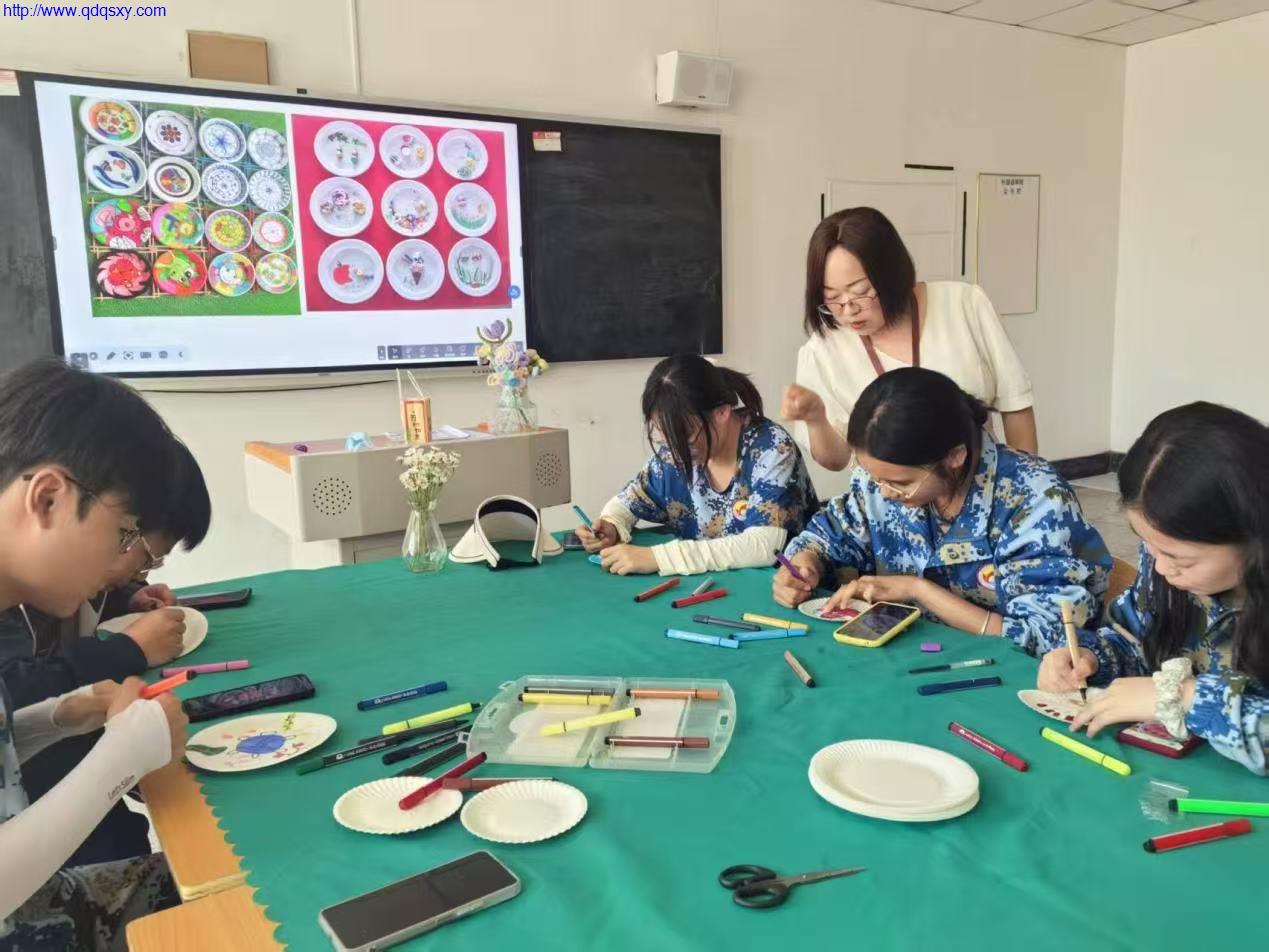 现代生活中,一次性用品如影随形,如吃完生日蛋糕后托盘的随意处置,给环境带来了沉重的负担。为此,督导师带领学生收集废弃蛋糕盘,努力使其焕发新的生命力。活动中,督导师先通过精心制作的课件为学生演示蛋糕盘的创意作品,讲解注意事项。在老师的指导下,学生们发挥创意,将蛋糕盘作为画布,用五彩斑斓的颜料描绘出一幅幅具有创意的作品。通过巧妙的构思和细腻的笔触,蛋糕盘被赋予了全新的生命——有的被绘制成细腻的的风景画,有的则变成了充满童趣的卡通形象,还有的化身为寓意深远的抽象作品。每一件作品都凝聚着学生们的心血和智慧,展现了他们对笔下生花和绿色环保理念的深刻理解和独特诠释。