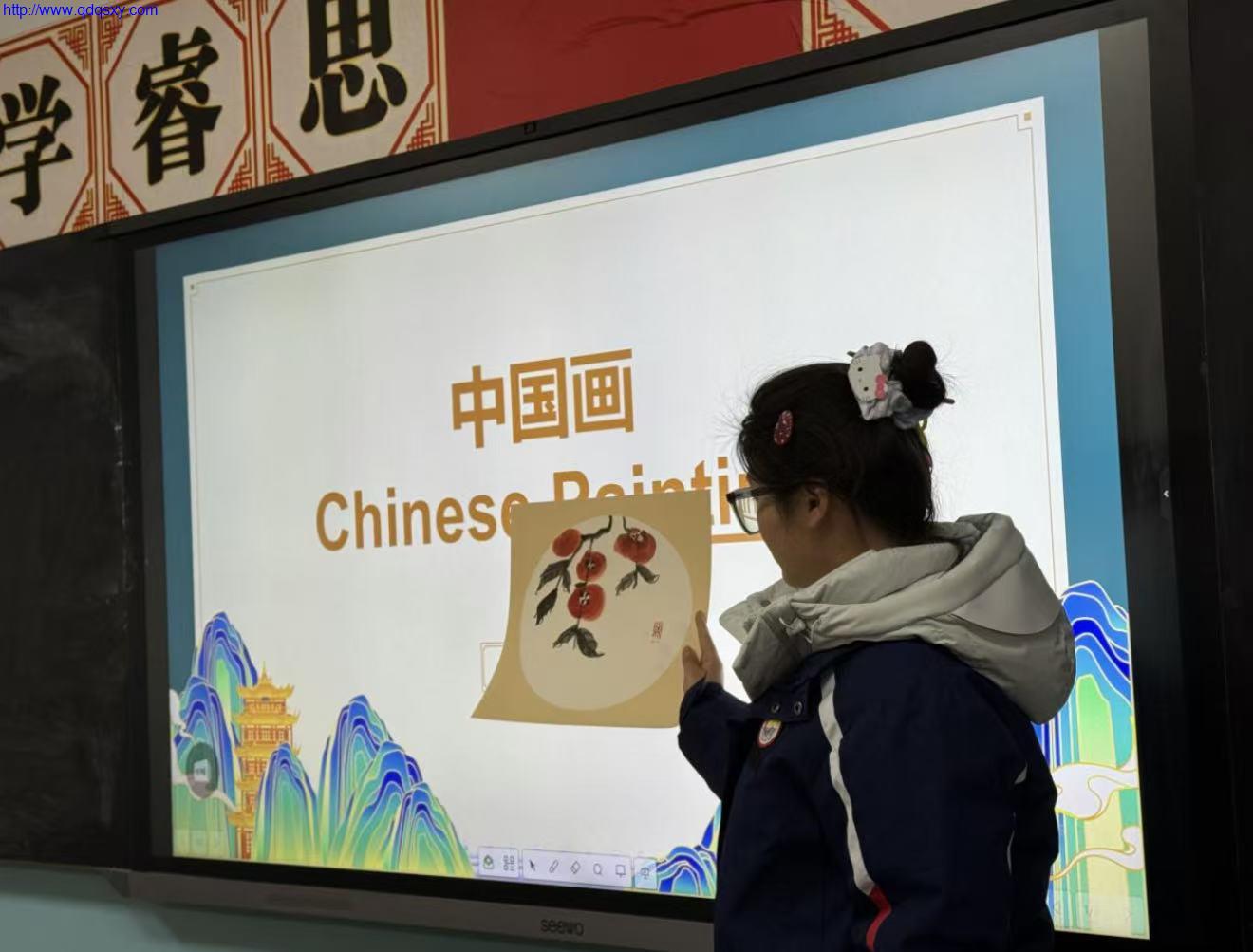 活动开篇,一段精心制作的双语短片瞬间将大家带入国画的意境世界。山水的雄浑壮阔、花鸟的灵动鲜活、人物的韵味悠长——三大经典题材的传世名作轮番呈现,搭配清晰流畅的英文解说,让学生不仅直观感受国画的视觉之美,更精准理解其艺术特质。短片结束后的趣味问答环节中,同学们踊跃举手,简单的互动,既巩固了双语知识点,也让大家对国画创作的基础工具建立起清晰认知。20分钟的创意展示环节,成为整场活动的高光时刻。各组依次陈列精心创作的画作,代表用流利的英文娓娓道来,每一段解说都将画作细节、创作技法与文化寓意深度融合,让在场师生既欣赏了画作,更听懂了画作里的“中国故事”。