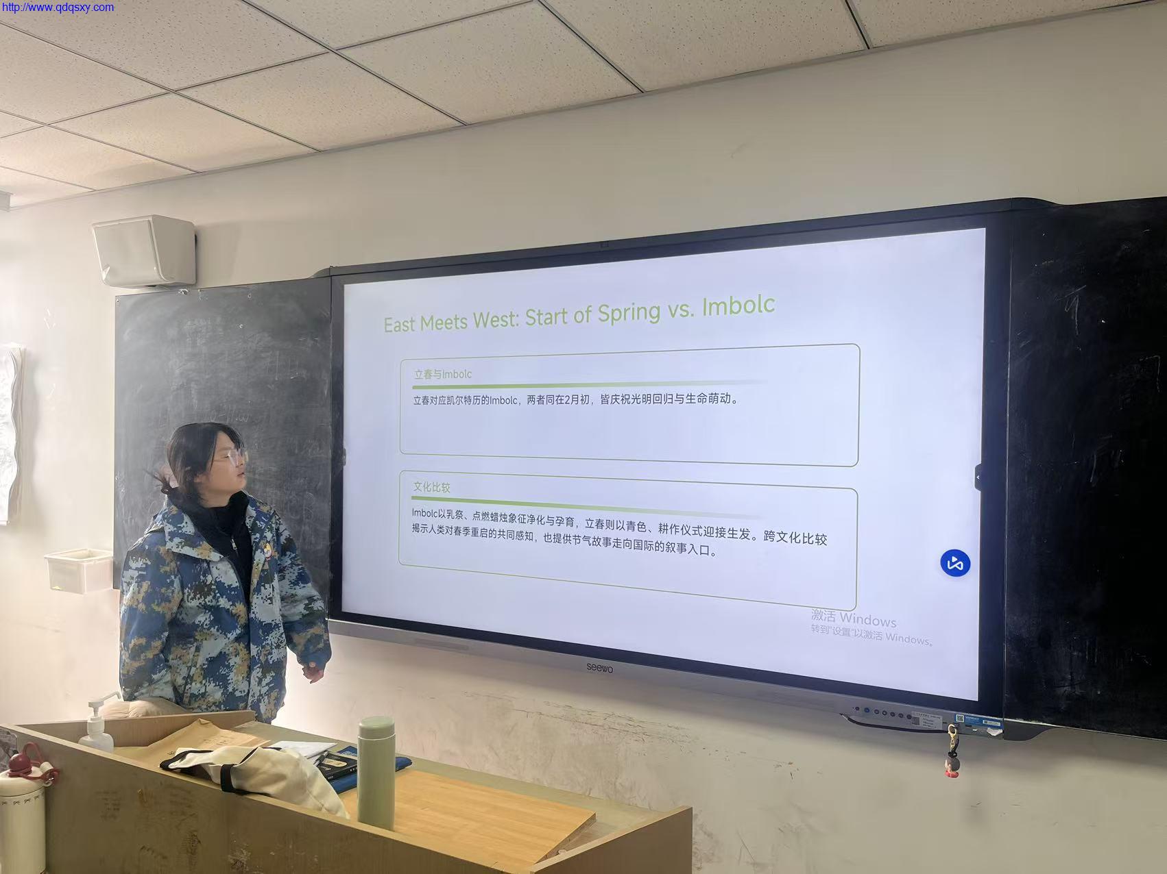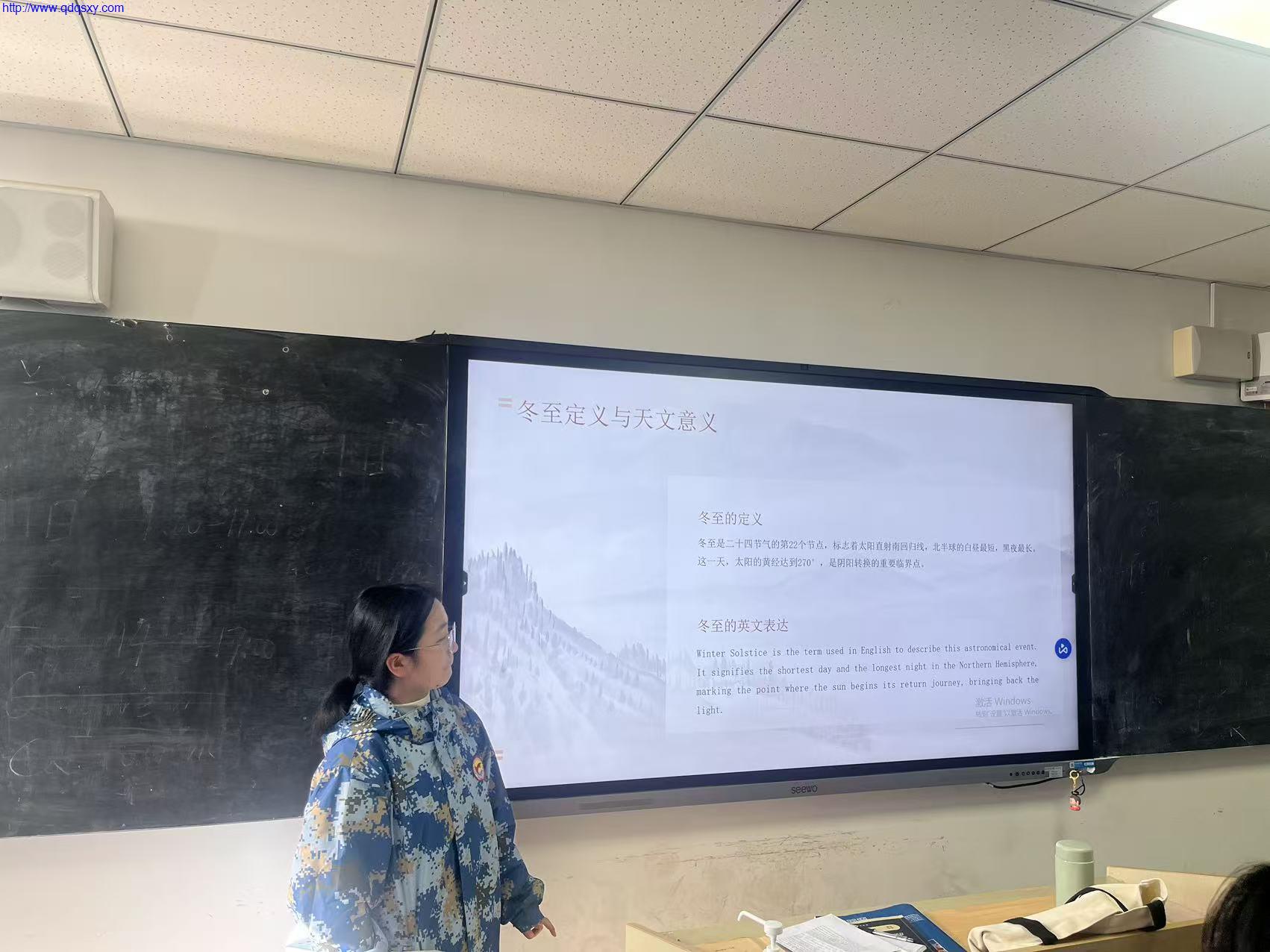 “冬至”小组的分享则充满了温暖的人间烟火气。他们从“Winter Solstice”的天文概念讲起,展示了北方“冬至饺子夏至面”的谚语,并详细解释了为何“不吃饺子会冻掉耳朵”的趣味传说。同时,他们还介绍了南方吃汤圆(Tangyuan, symbolizing family reunion)的习俗,寓意团团圆圆。更有同学提到了英国等欧洲国家在冬至时节点燃火炬、庆祝阳光回归的传统,将“冬至大如年”的中式情怀与人类对光明渴望的普世情感连接起来。