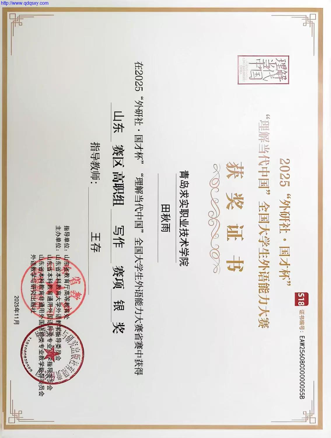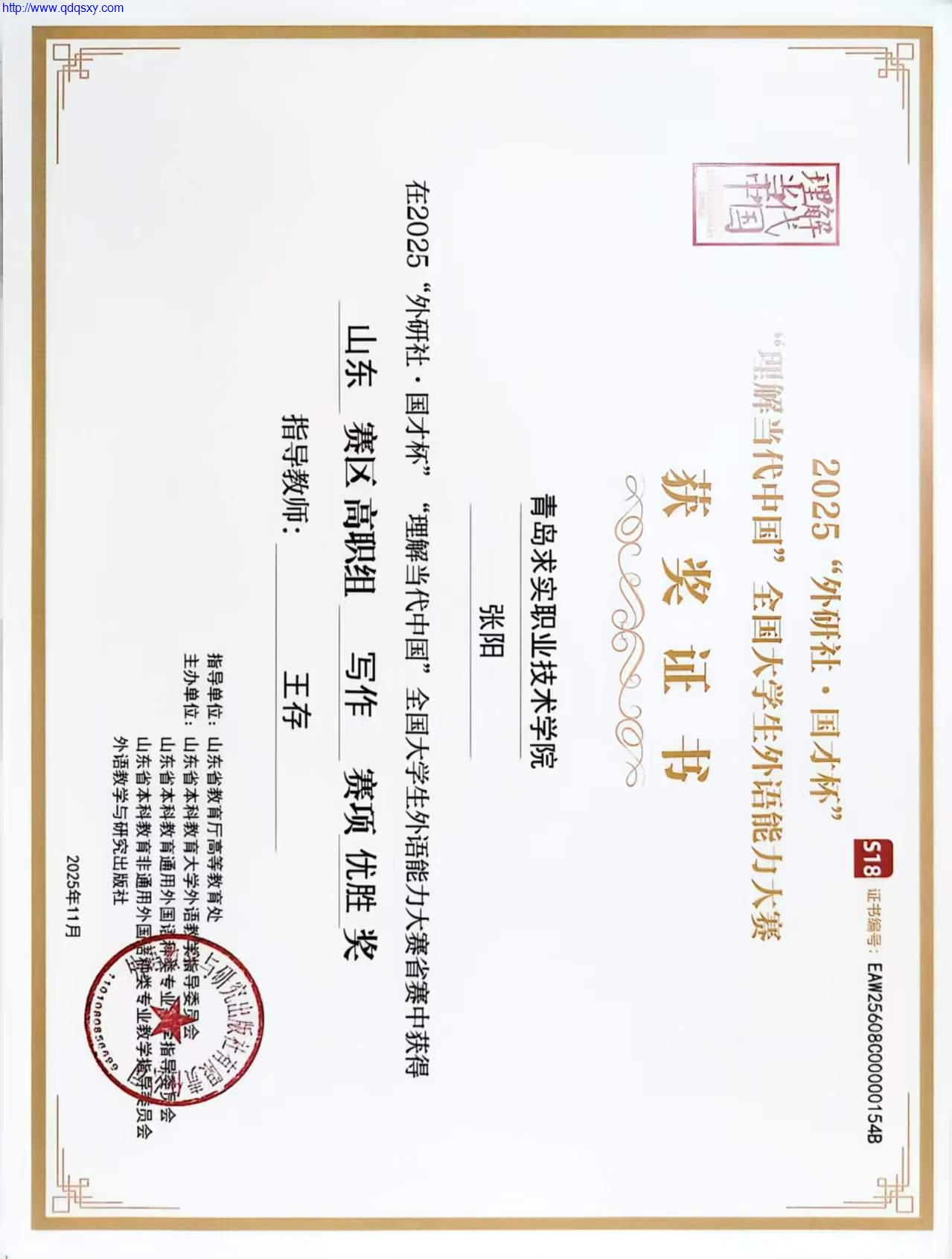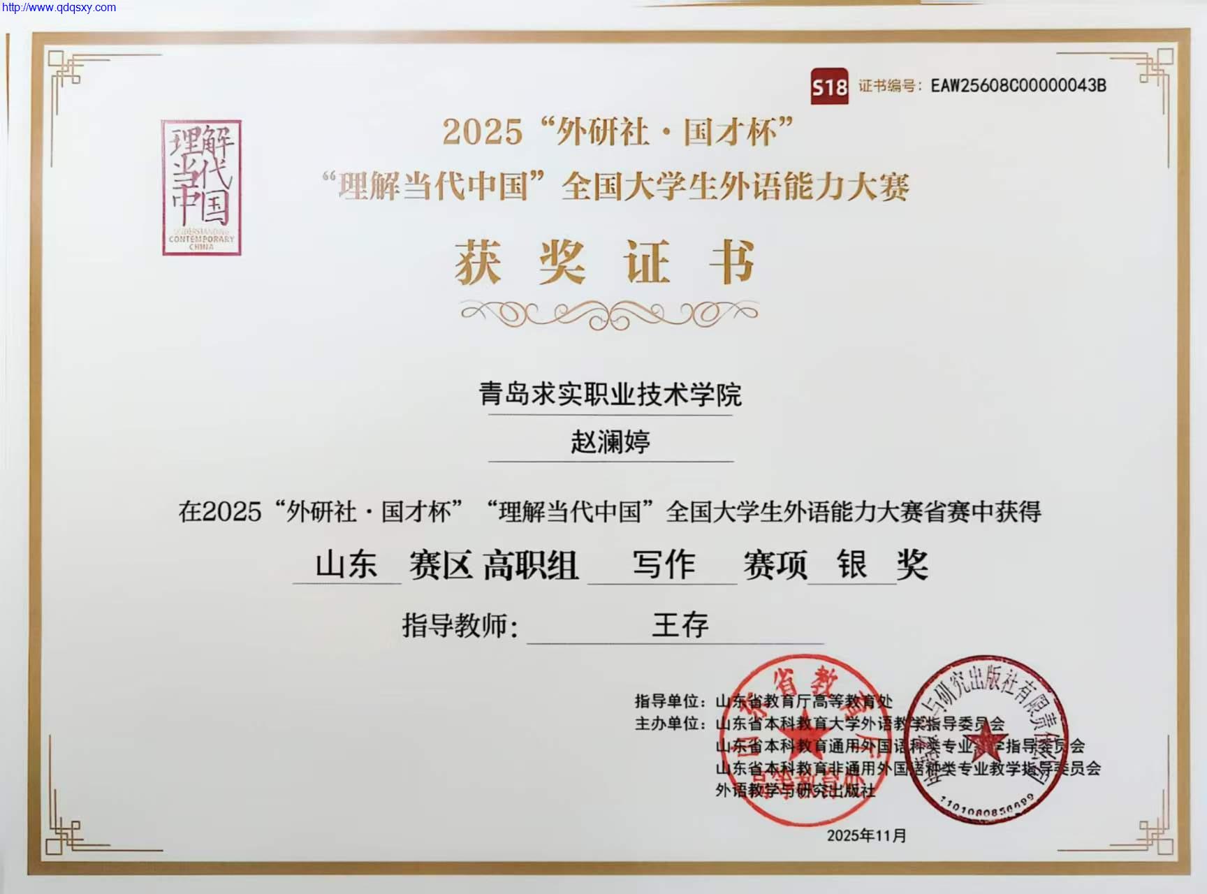 由山东省教育厅高等教育处指导、外语教学与研究出版社主办的2025年“外研社?国才杯”“理解当代中国”全国大学生外语能力写作大赛(省赛)圆满落幕。我院学子表现亮眼,医药学院赵澜婷同学、外国语学院田秋雨同学双双摘得银奖,医药学院张阳同学荣获优胜奖。此次参赛由外国语学院王存老师全程悉心指导。