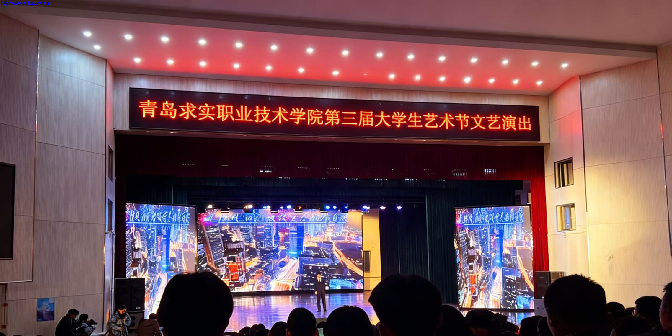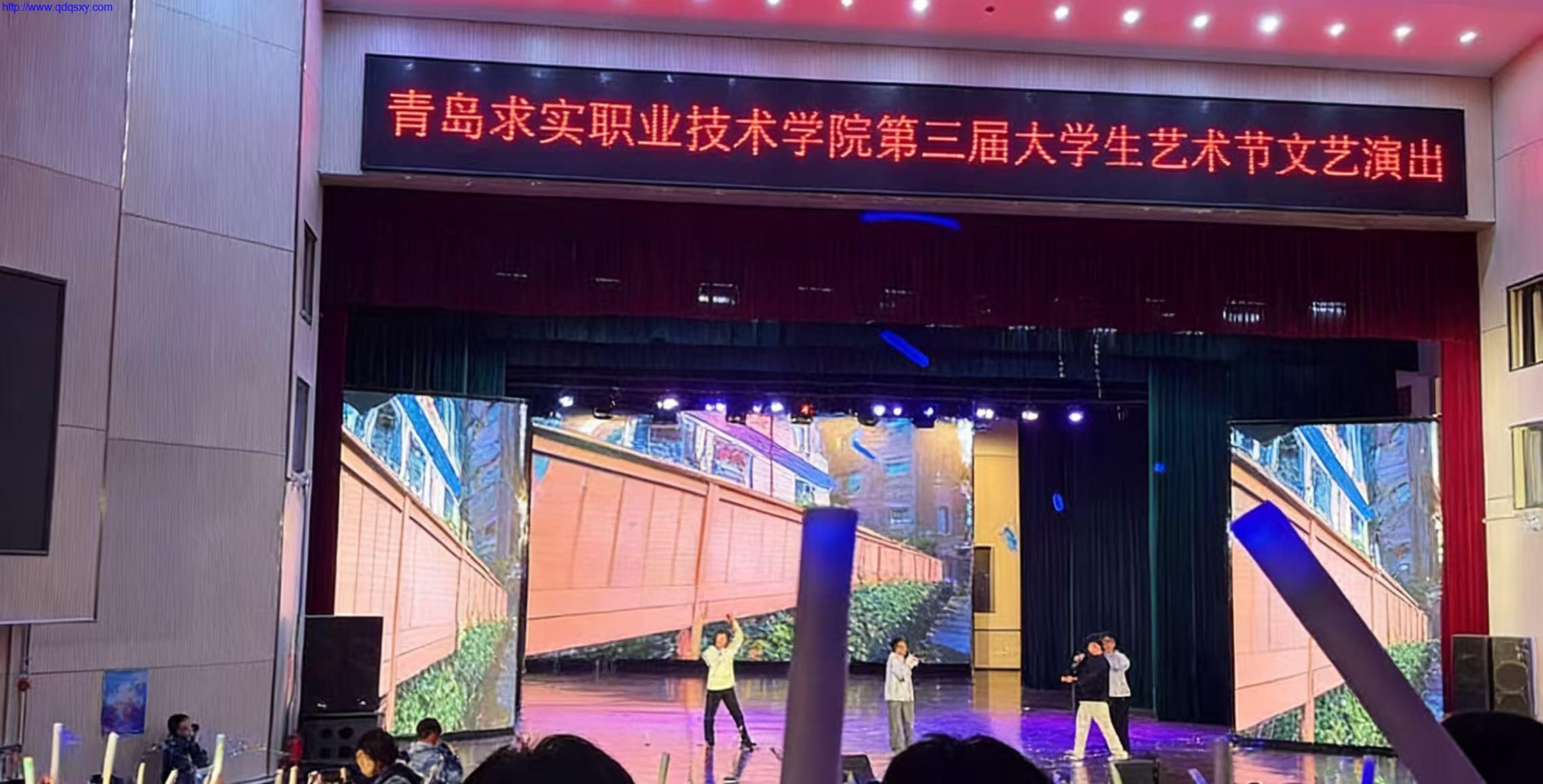 演出厅内早已座无虚席,红色的座椅间,一根根荧光棒随着音乐的前奏轻轻摇晃,像是夜空中闪烁的星子。舞台上方的电子屏赫然映着“青岛求实职业技术学院第三届大学生艺术节文艺演出”的字样,醒目的红色字体,既是这场盛会的序章,也是求实学子青春风采的宣告。幕布拉开的瞬间,绚烂的灯光铺洒而下,大屏上流动的画面与舞台场景交相辉映,仿佛将整个校园校园的活力都浓缩在了这一方舞台之上。