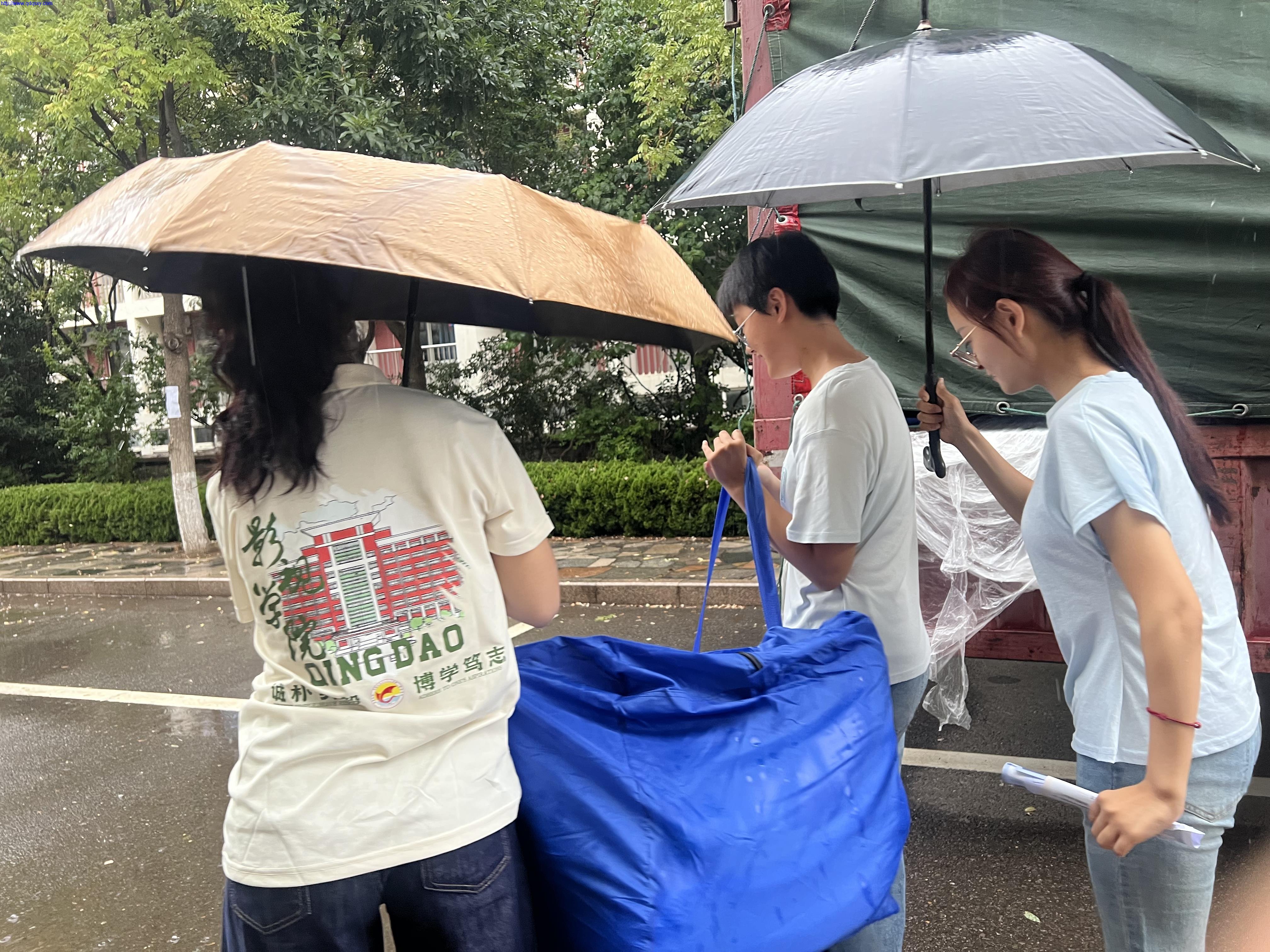 来自淄博的新生李同学表示:突然的降雨让我很慌乱,三位学姐立刻过来帮忙撑伞抬行李,行李一点也没有被淋湿让我很感动,这真是个温暖的集体。包容、友善、关爱不仅是上墙的标语,更是学姐团迎新的行动指南。