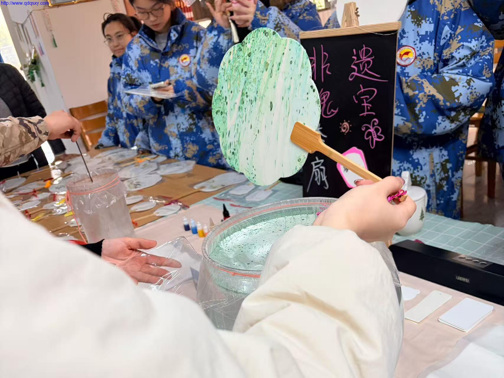 调色、勾勒、填充、晾干,大家耐心打磨每一个细节,原本素净的扇面在指尖逐渐变得色彩斑斓、意蕴悠长。期间,师生们相互交流创作思路,分享传统文化学习心得,现场氛围热烈而温馨。“这次活动让我近距离接触了漆艺这门传统手艺,不仅锻炼了动手能力,更让我感受到了中华传统文化的匠心与温度。”影视学院学生王同学拿着自己亲手制作的漆扇,脸上满是成就感。