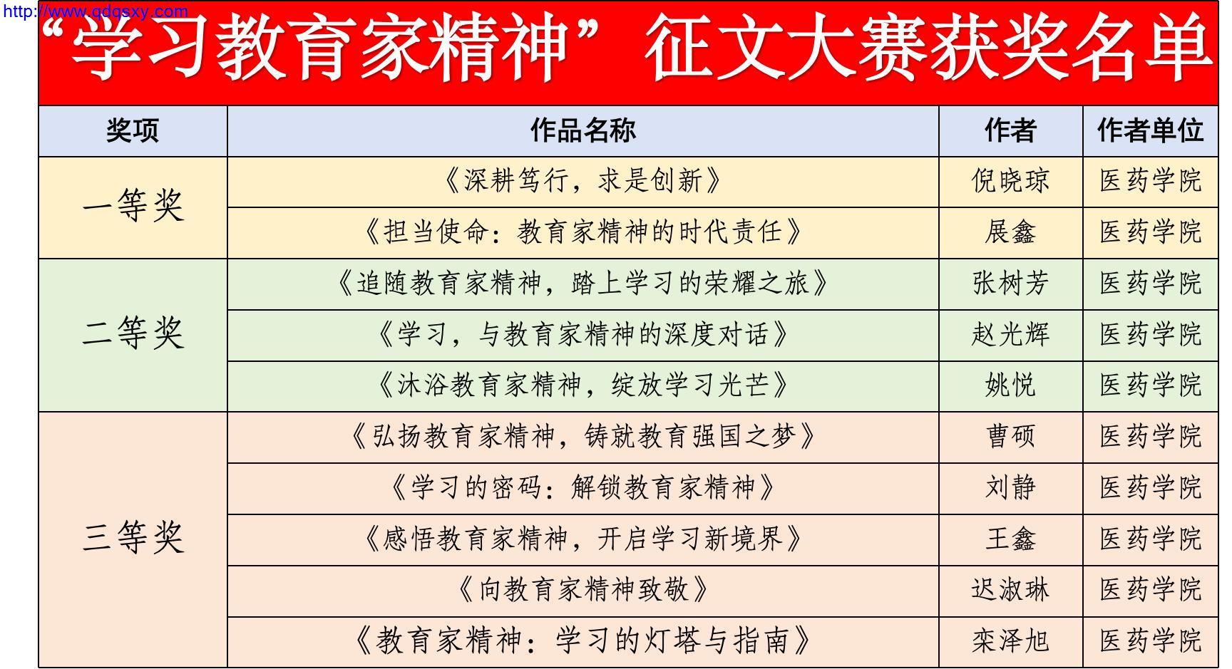 “人无精神则不立,国无精神则不强”,为了深入贯彻落实习近平总书记提出的教育家精神,医药学院组织开展了“学习教育家精神”主题征文比赛,我院教职工积极响应,踊跃参加,共收到征文稿件32篇,经评委会审核,最终评选出一等奖两名,二等奖三名,三等奖五名,以下为获奖名单。
