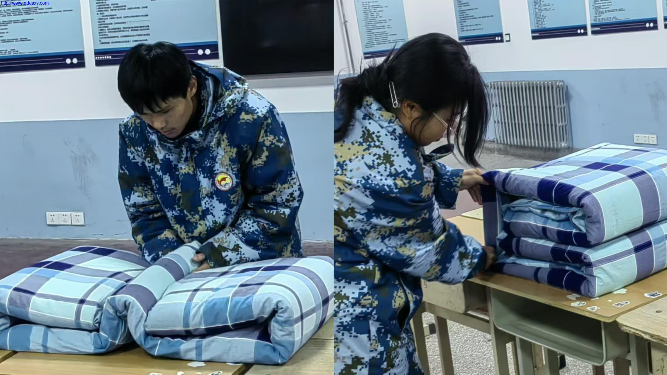 比赛现场气氛热烈,学生们热情高涨、摩拳擦掌。“出门看队列,进门看内务”,军被作为内务的关键部分,其整理水平是学生综合素养的重要体现。在比赛中,随着指令下达,学生们迅速行动,他们动作娴熟、有条不紊。首先将被子仔细铺平,不放过任何一个褶皱,然后用力压实,让被子更加紧实。接下来的翻折、挑细节、折直角、捏线条等步骤更是展现出极高技巧性,每个动作都精准到位。一床床被子在学生们的精心打造下,逐渐变成了棱角分明、方方正正的 “豆腐块”,宛如一件件精美的艺术品。